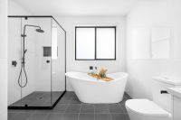 *Three luxurious bathrooms, all beautifully tiled and enhanced with premium fittings and fixtures, including a stunning freestanding bathtub in the main bathroom.