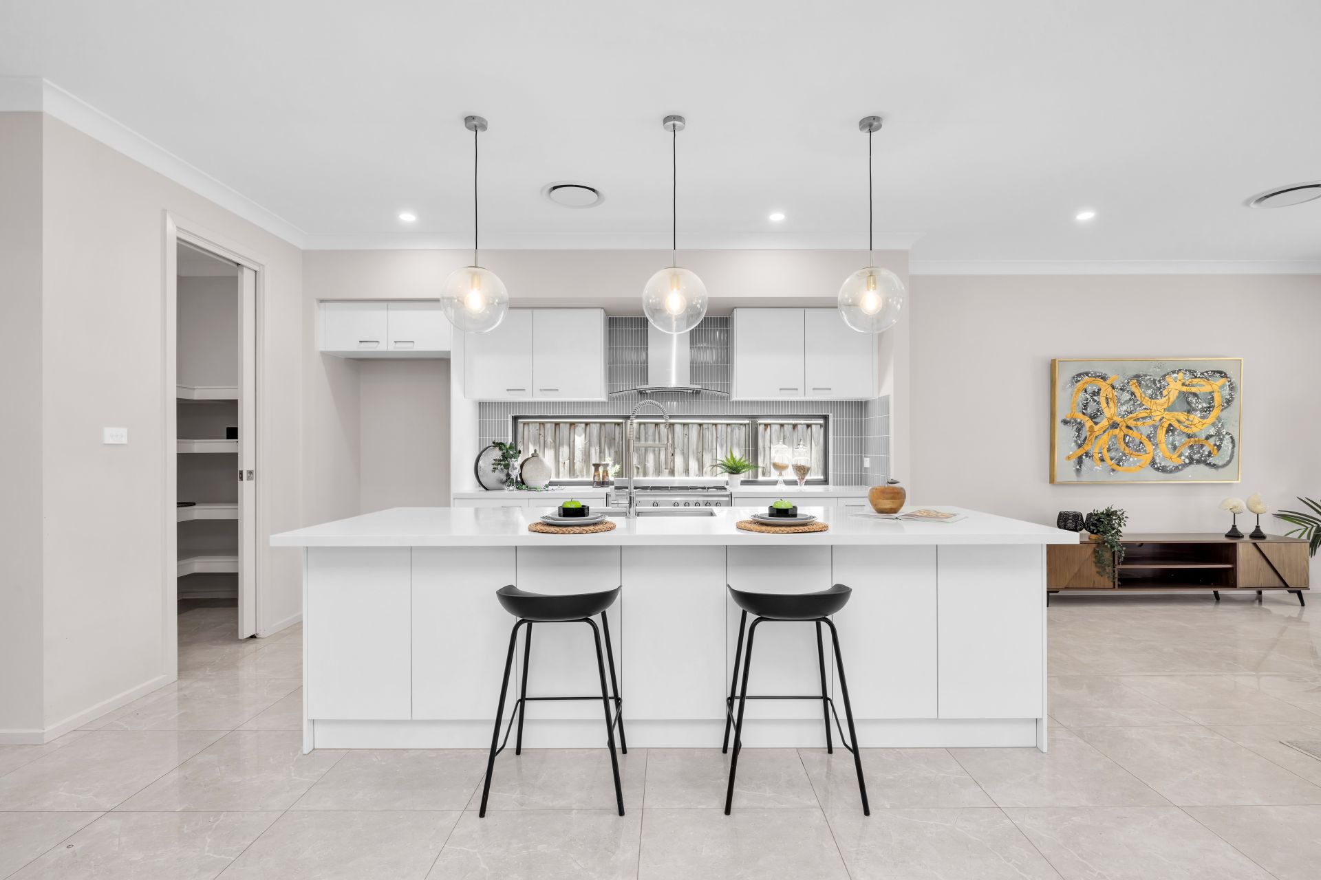 *Gourmet kitchen featuring 900mm Smeg stainless-steel appliances, gas cooktop, stone benchtops, a spacious island bench, dishwasher, and abundant storage, complemented by a walk-in pantry for added convenience.